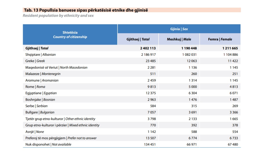 Janë publikuar të dhënat bazë të Censit 2023 sipas përkatësisë etnike dhe gjinisë. Në bazë të dhënave 99.4% e popullsisë janë me kombësi shqiptare.
